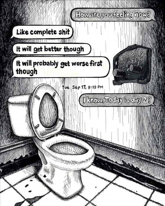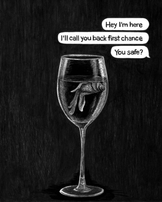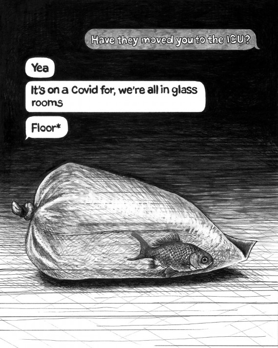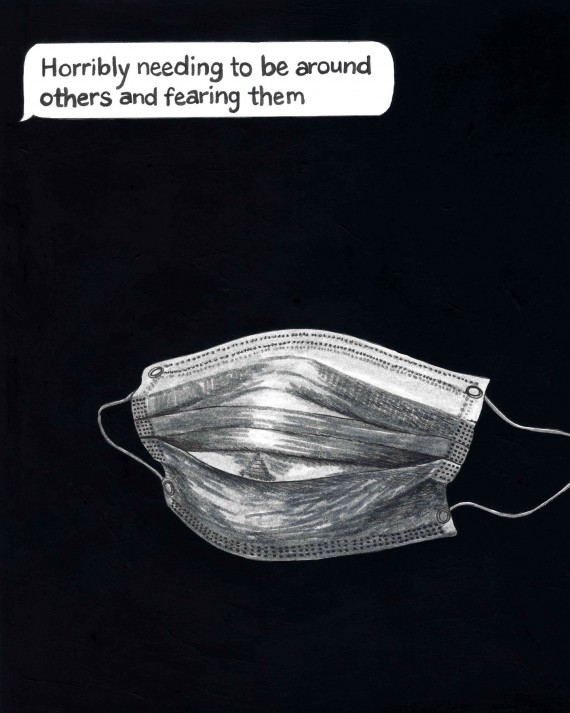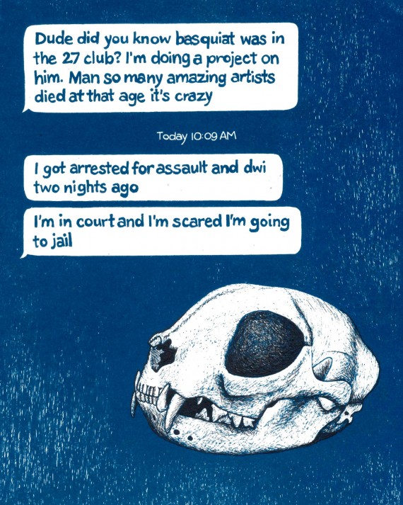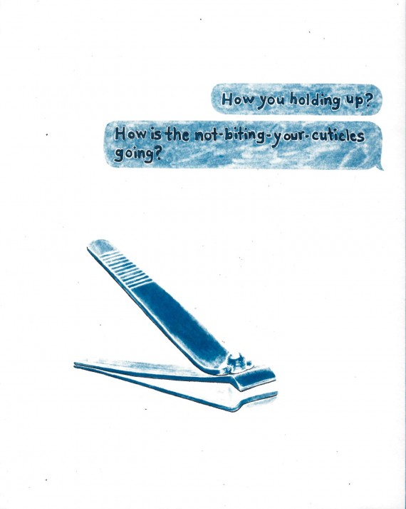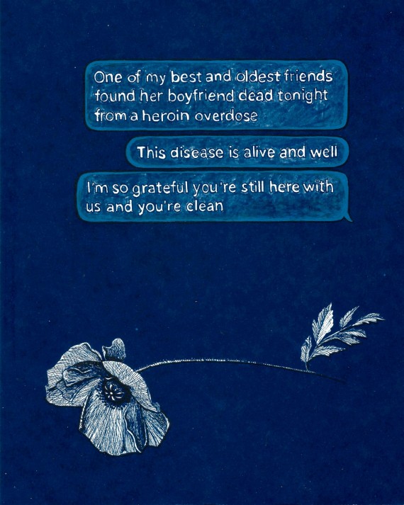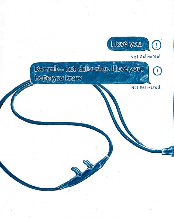The pieces in Works In Rough Going contain words collected and curated from text message exchanges between members of the recovery community paired with the images that these words evoked for me when I took the time to sit with them. Text messages are fleeting and digital. They aren’t meant to last. Yet in the past year, these pixels on screens became lifelines—essential and even sacred—even as the moments they document capture fear and setbacks as well as hope. They deserved to be treated with reverence. I wanted to honor them, to memorialize them and commit them to permanence, deliberately and slowly. I hand drew all of the pieces in this exhibit, sometimes taking the further step of using the sun to expose and create cyanotype prints of the drawn images. Through the process of hand drawing and graphically representing these exchanges, I hope to underscore the kindness and connection when some of the most vulnerable in our midst suddenly became even more so. I hope this exhibit asks important questions about the nature of community, the immense toll of life under lockdown for vulnerable populations, and how communities continue to care and protect one another when their normal ways of doing so are impossible.